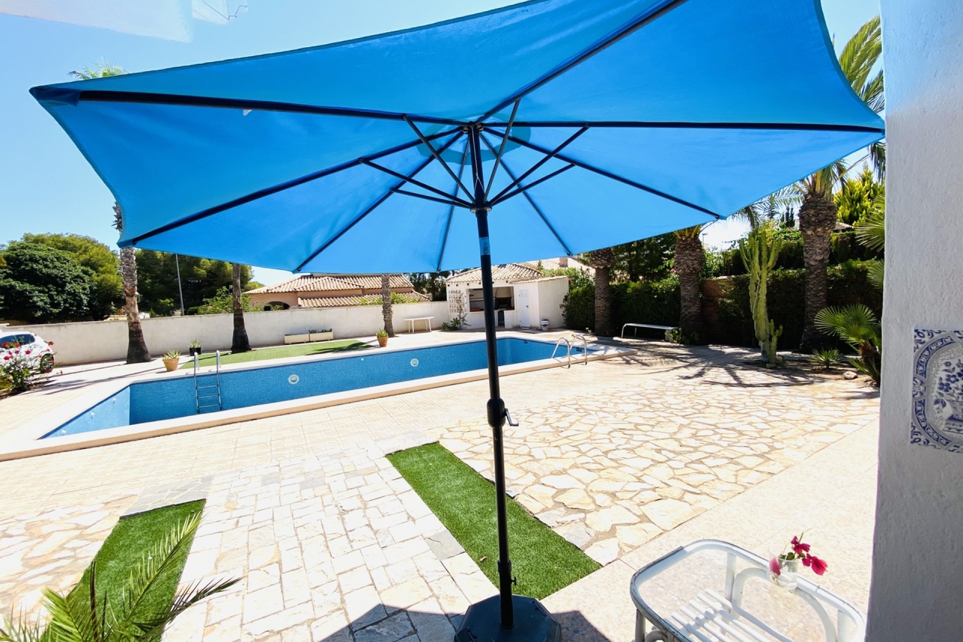 VILLA LA ZENIA BEACH SIDE !!! in the the warmest part of Europe, 500 meters from the Mediterranean Sea! !!! A great offer in this location !!! On the huge corner plot 1142 sq. m. with a great flowered garden. 7 bedroos, 4 bathrooms, 2 spacious living rooms, 2 kitchens, 3 dining areas in house, outdoor kitchen, terraces, 54 sq.m. swimming pool, trastero, garage, garden, solarium. The ground floor is 257.83 sq.m The 1 floor is 128.94 sq.m - can be used as independent flat for 5-6 people. An exquisite house in a romantic Spanish style with added French-Belgian charm. Suitable for a large family. There is a place for children of all ages in the large garden.