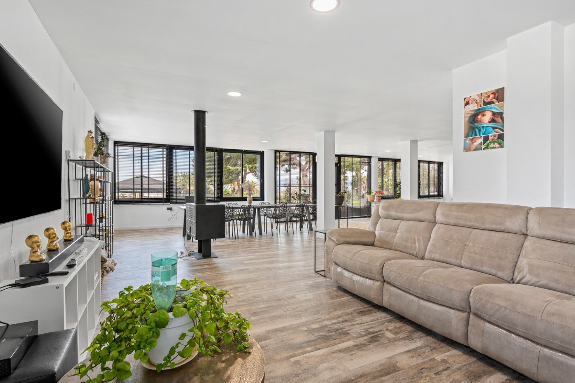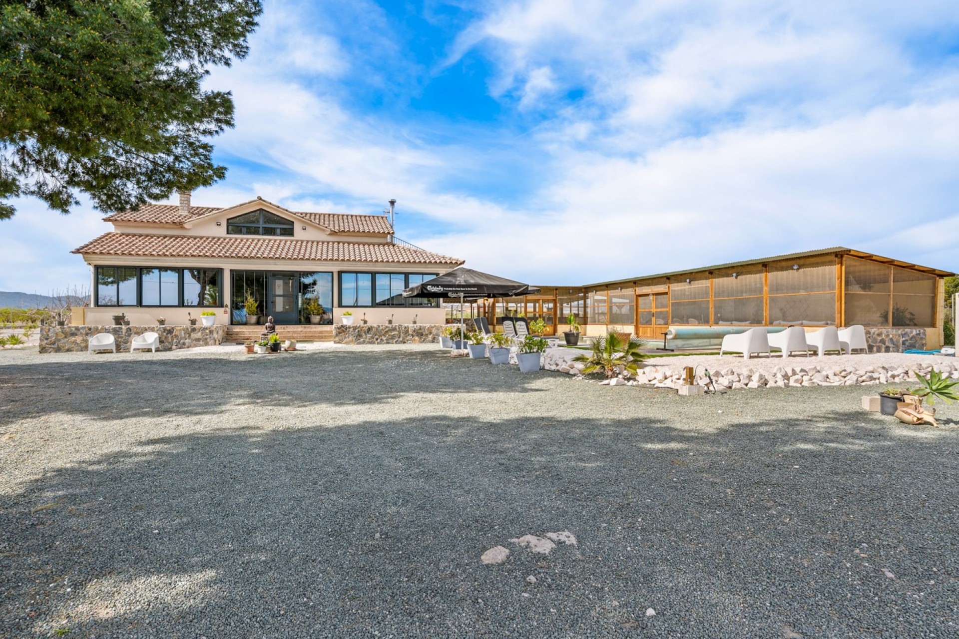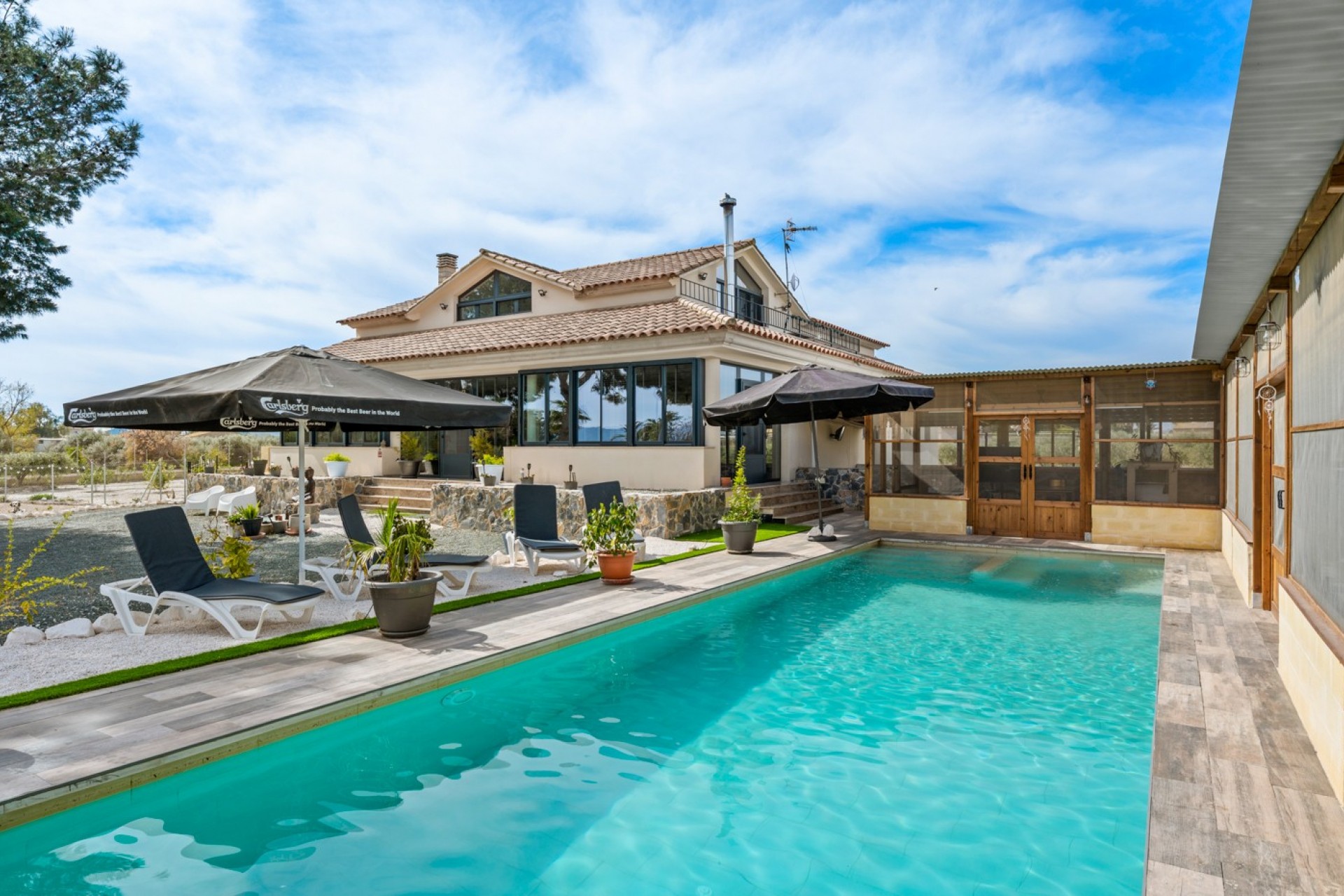 À l’extérieur, la villa continue de séduire avec un garage privé, un espace barbecue et une magnifique piscine de 12 x 4 mètres. Vous y trouverez également un salon fermé avec cuisine extérieure et douche, parfait pour profiter des soirées d’été. Le vaste terrain est agrémenté d’oliviers et d’arbres fruitiers, renforçant son charme méditerranéen.