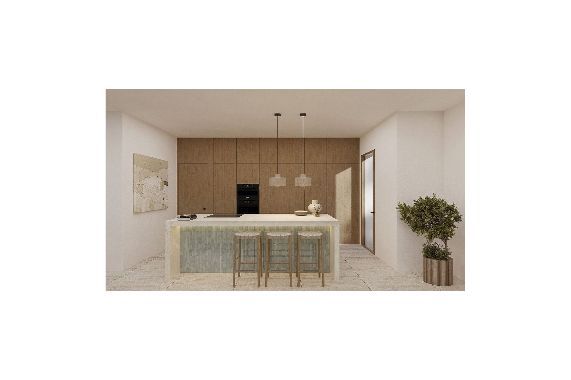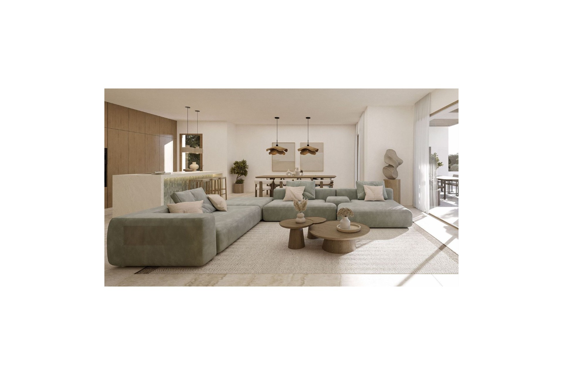 Gebouwd op een perceel van meer dan 1.000 m², is de woning verdeeld over twee niveaus en heeft in totaal 4 ruime slaapkamers en 3 volledige badkamers. Op de begane grond verbindt een open ruimte de woonkamer, de eetkamer en een moderne volledig uitgeruste keuken met een eiland en een ontbijtbar. Grote schuiframen van vloer tot plafond integreren het interieur perfect met het hoofdterras op het zuiden, waardoor het hele jaar door een lichte en gastvrije sfeer ontstaat. Op deze verdieping bevindt zich ook een slaapkamer en een complete badkamer.